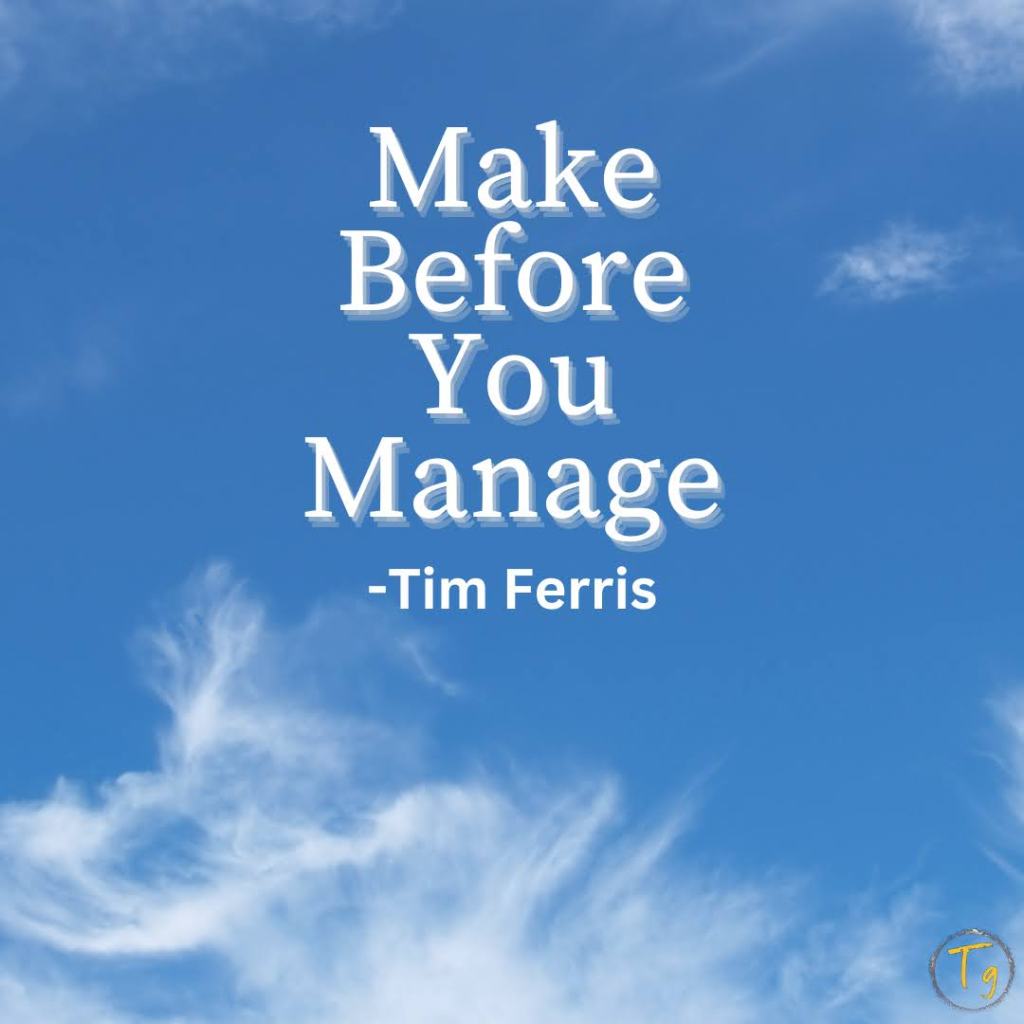 Tim Ferris is an American entrepreneur, investor, author, podcaster, and lifestyle guru. He is creative and busy. He coined the simple four word phrase, “make before you manage” to remind him to remain creative.