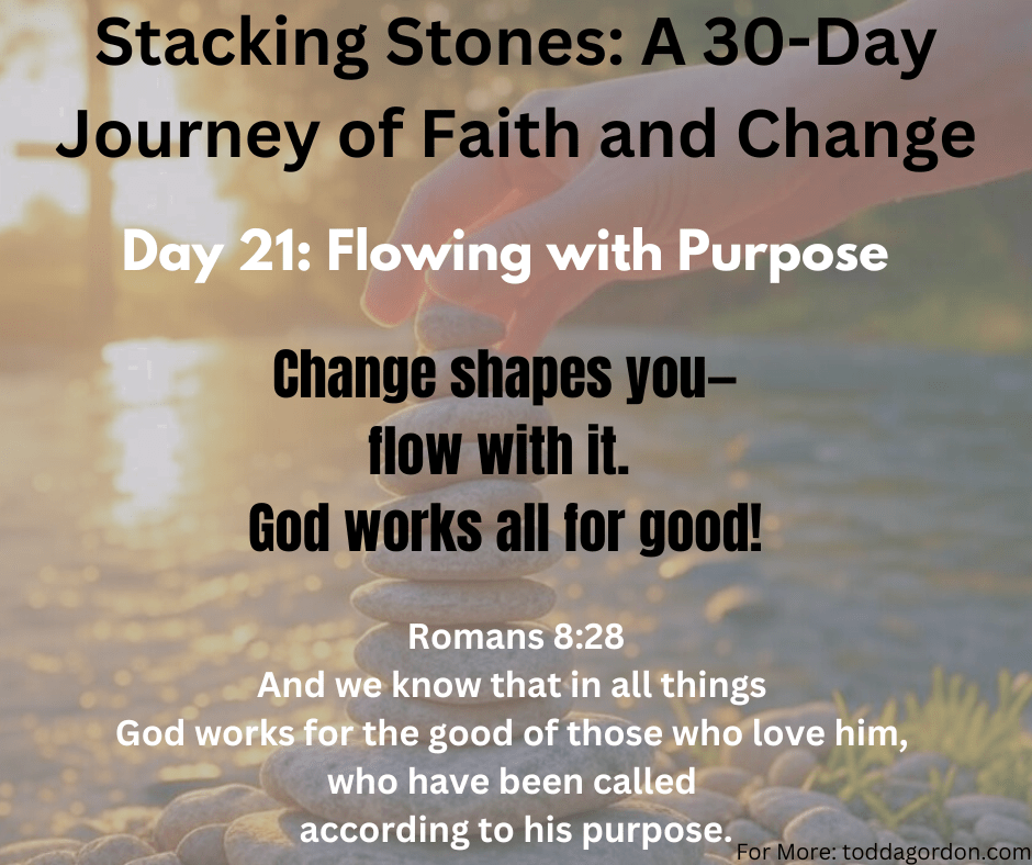 Life’s a river—adapt or stall. Romans 8:28 (ESV) assures, “…all things work together for good…” Have you resisted turns? Going with the flow can help you to be stronger and wiser. What change can you ride? God can use it for good.