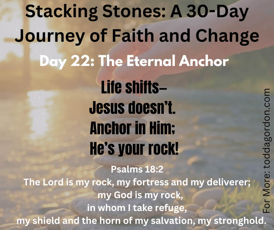 Jesus is steady—life isn’t. Psalm 18:2 (ESV) calls Him “my rock…” What’s rocking you? He’s your anchor—unchanging and sure. Release worry—He’s got you.