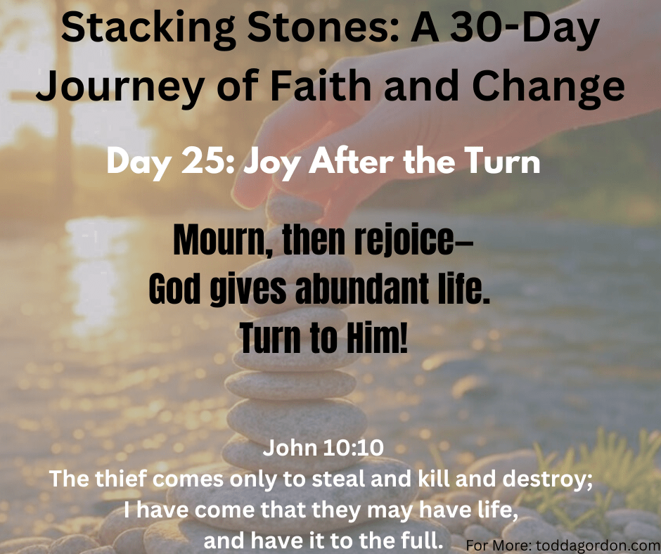 Mourn the past, then rejoice—God redeems. John 10:10 (ESV) offers “…life… abundantly.” Have you ever wasted time—had distractions—I sure have, but turning back brought joy. What’s your detour? Let go—He’s got abundance ahead.