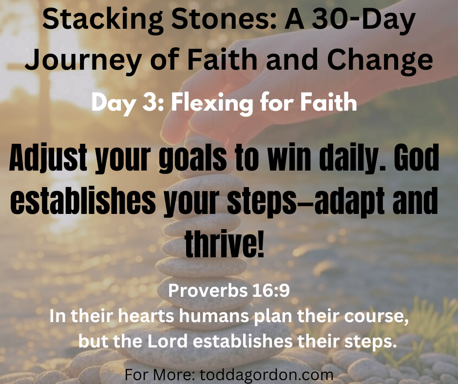Life shifts, and our goals should too. As an Athletic Director, I hit 10,000 steps daily without blinking. Now, working remotely, that’s tougher—especially in Iowa’s brutal winters. So, I cut it to 5,000—still a win! Proverbs 16:9 (ESV) says, “The heart of man plans his way, but the Lord establishes his steps.” Adjusting isn’t defeat; it’s discernment. God’s guiding us through seasons, and clinging to old targets can steal our joy. I’d rather cheer for a reachable goal than mourn an impossible one.