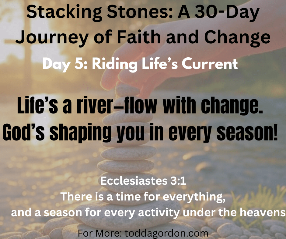 “No man steps in a river twice,” Heraclitus said. Life’s an ever-flowing stream—always shifting, never static. Fighting it exhausts us, but flowing with it? That’s where growth lives. Ecclesiastes 3:1 (ESV) echoes, “For everything there is a season…” I’ve resisted—new jobs, moves, losing Mom—clinging to what was. But God’s in every twist, shaping me through the current. Letting go of my old step goal taught me this—change isn’t the enemy; it’s the sculptor.